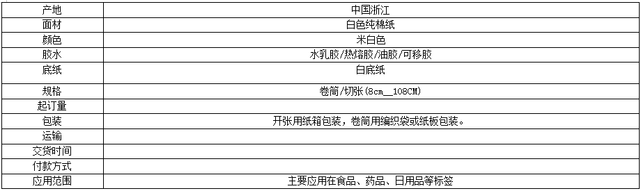 注:产品的面纸、底纸、胶种、包装可以跟据客户要求订做,可切张/卷筒。