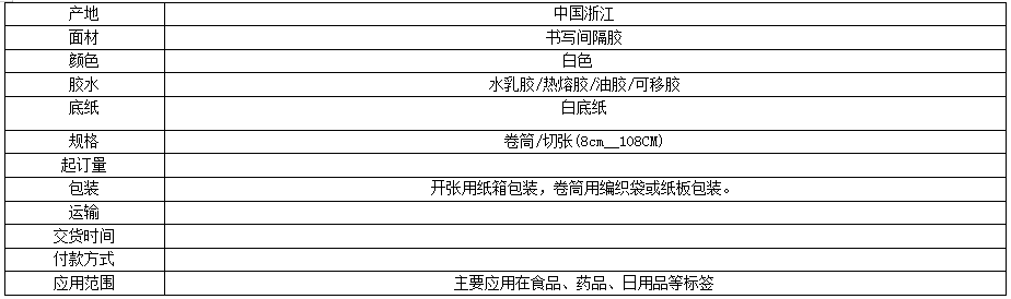 注:产品的面纸、底纸、胶种、包装可以跟据客户要求订做,可切张/卷筒。