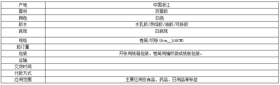 注:产品的面纸、底纸、胶种、包装可以跟据客户要求订做,可切张/卷筒。