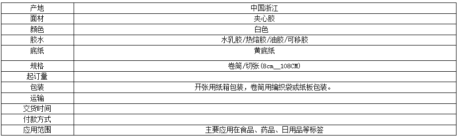 注:产品的面纸、底纸、胶种、包装可以跟据客户要求订做,可切张/卷筒。