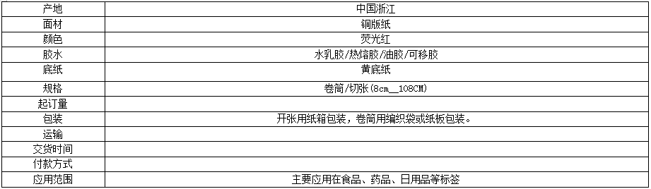 注:产品的面纸、底纸、胶种、包装可以跟据客户要求订做,可切张/卷筒。